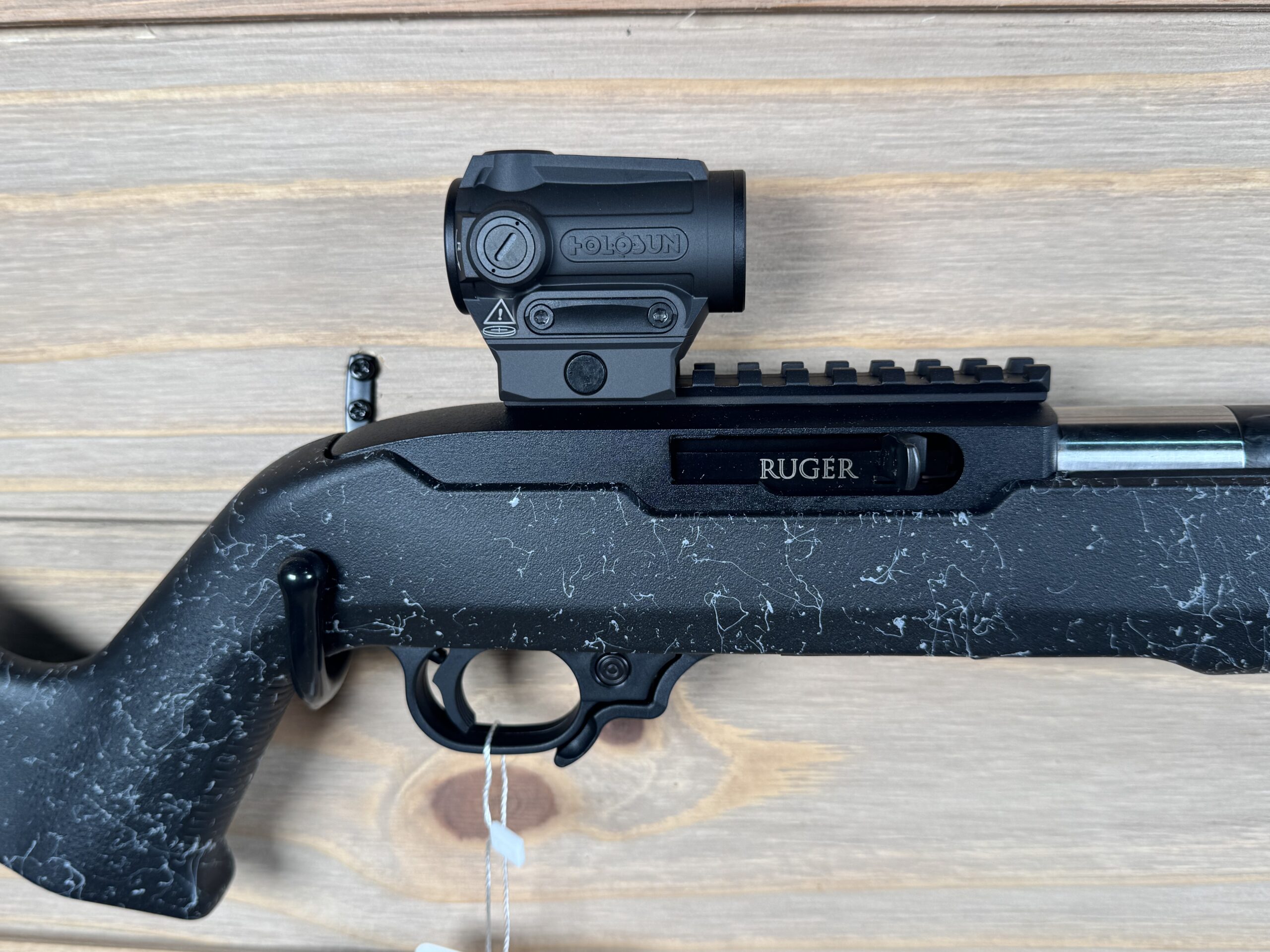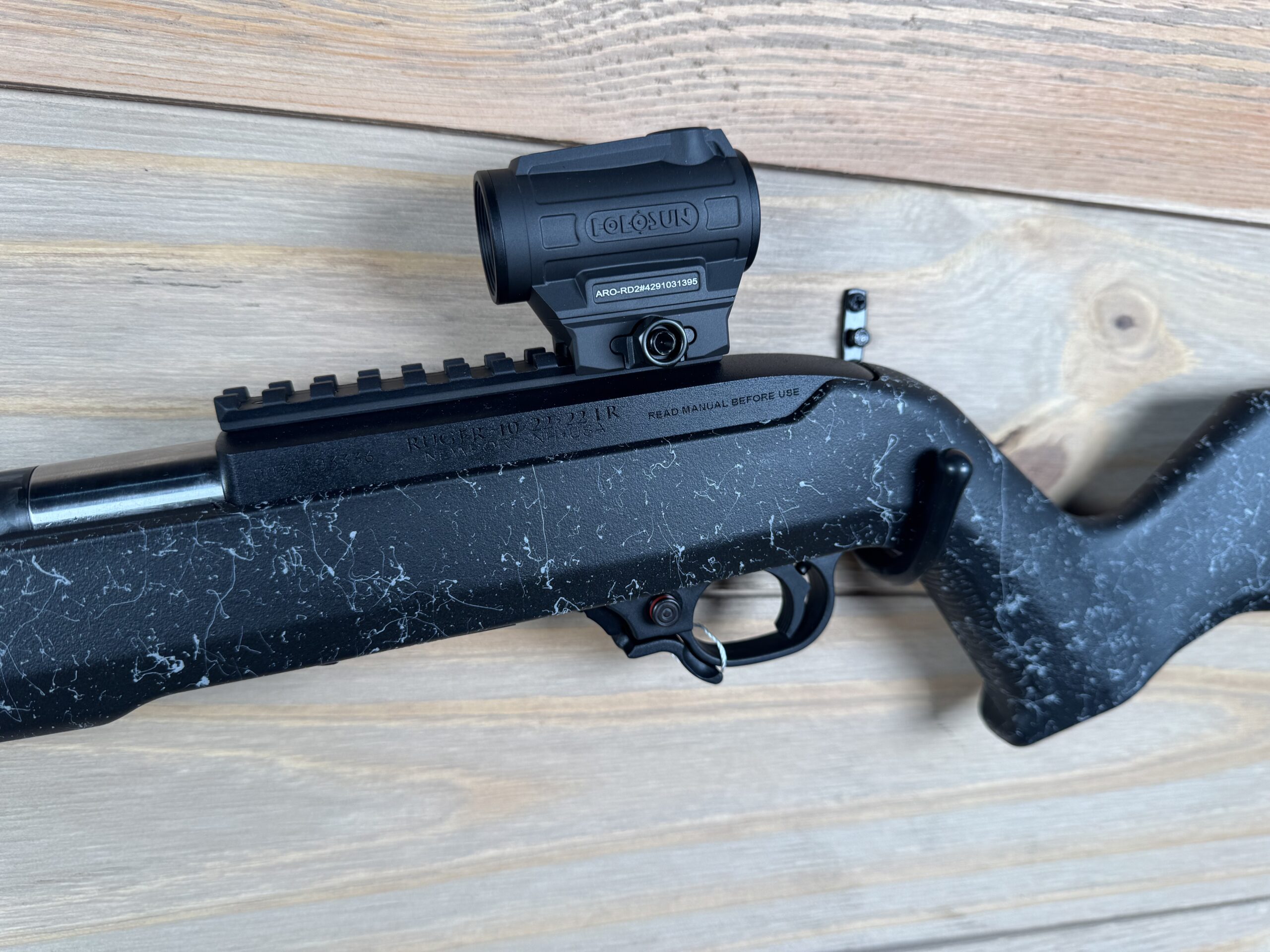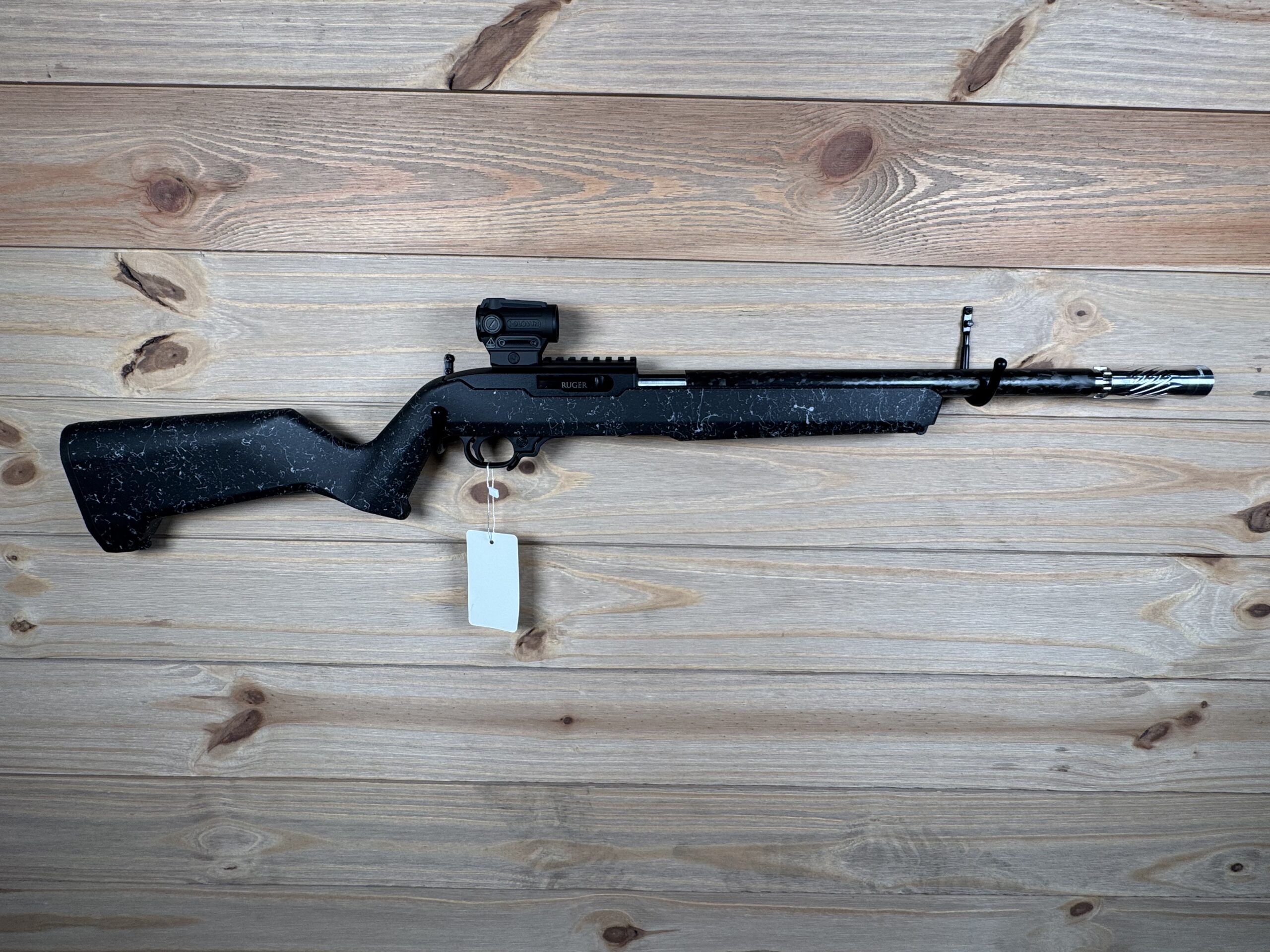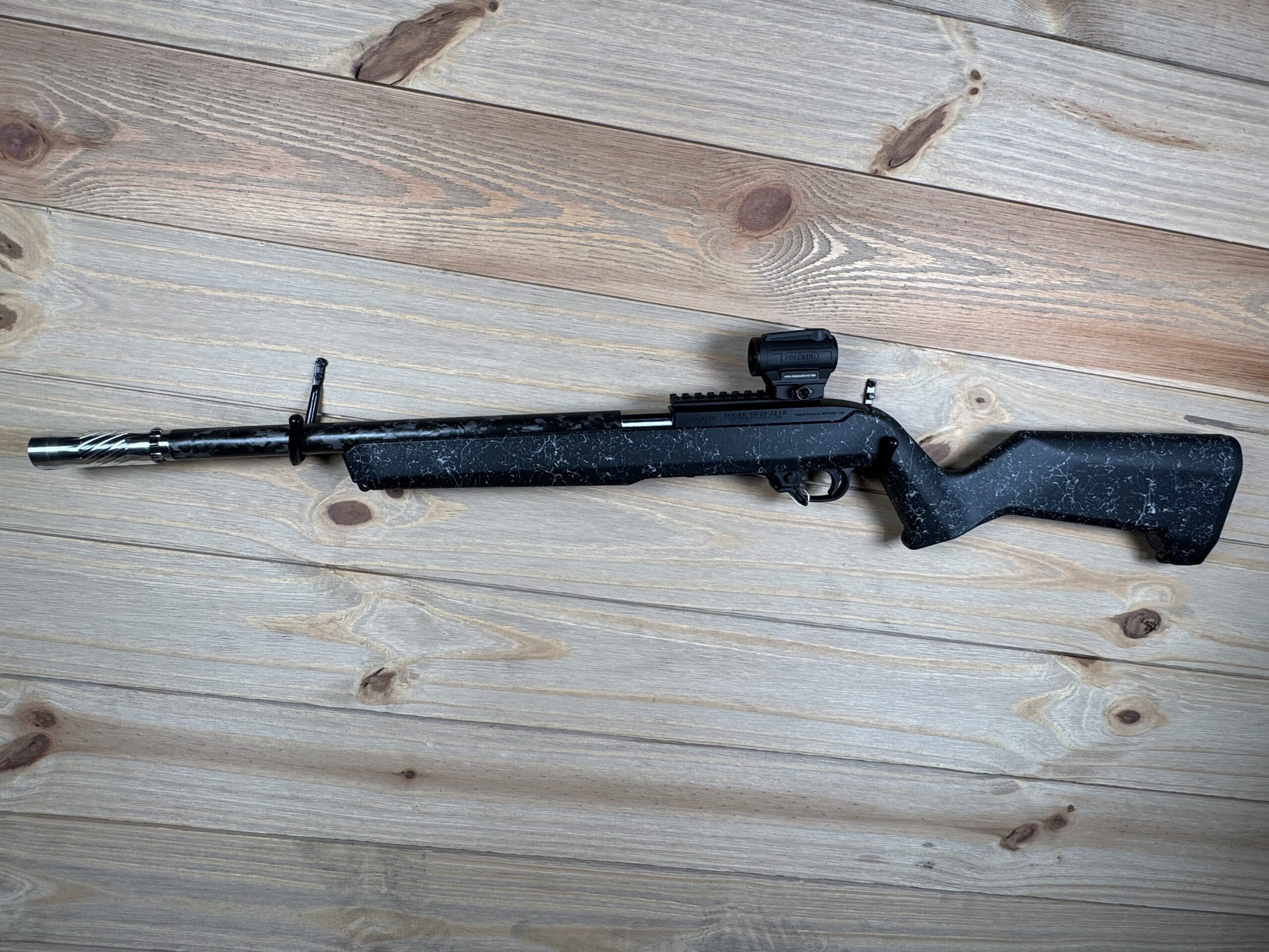 Brand new Ruger 10/22 Carbon Fiber Package! This package includes a brand new Ruger 10/22 Carbon with 16″ Carbon fiber barrel, Magpul X-22 stock, Holosun ARO RD-2 red dot, and an Anechoic pipsqueak .22lr suppressor in the raw finish. These are all brand new components that are set up and ready to go!